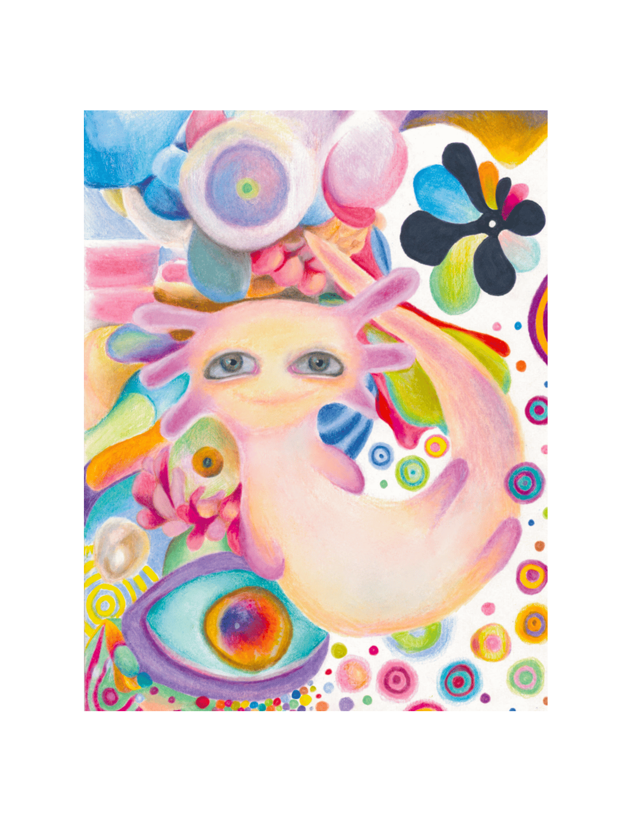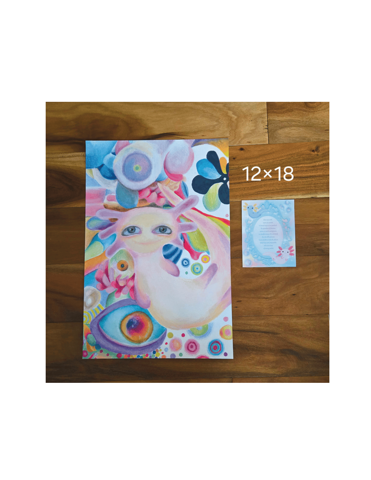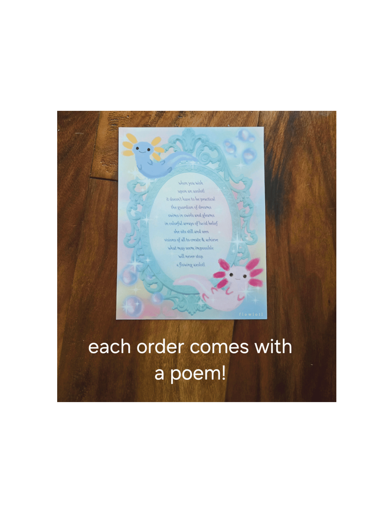 A drawing inspired by creativity and dreams. Hang this print nearby where you sleep and the axolotl guardian will grant your dreams with new ideas and creative visions!